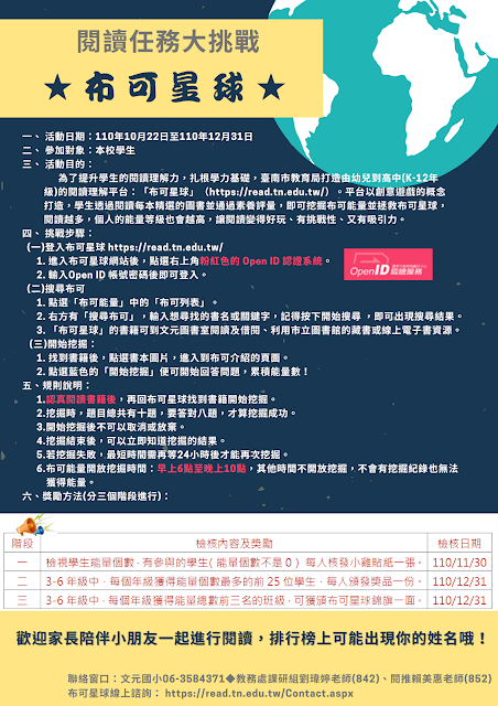 獎勵請詳閱學校公告,另外,圖書室也有設置布可星球專區(在舞臺),歡迎大家來借閱喔!